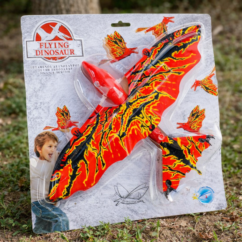 Детска играчка летящ дракон, изработен от пластмаса в червен цвят с огнени шарки.