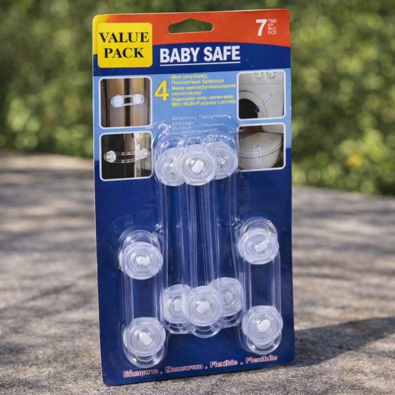 Икономична опаковка от 7 броя (4 малки и 3 големи) мултифункционални заключалки, изработени от еластичен и безвреден материал.