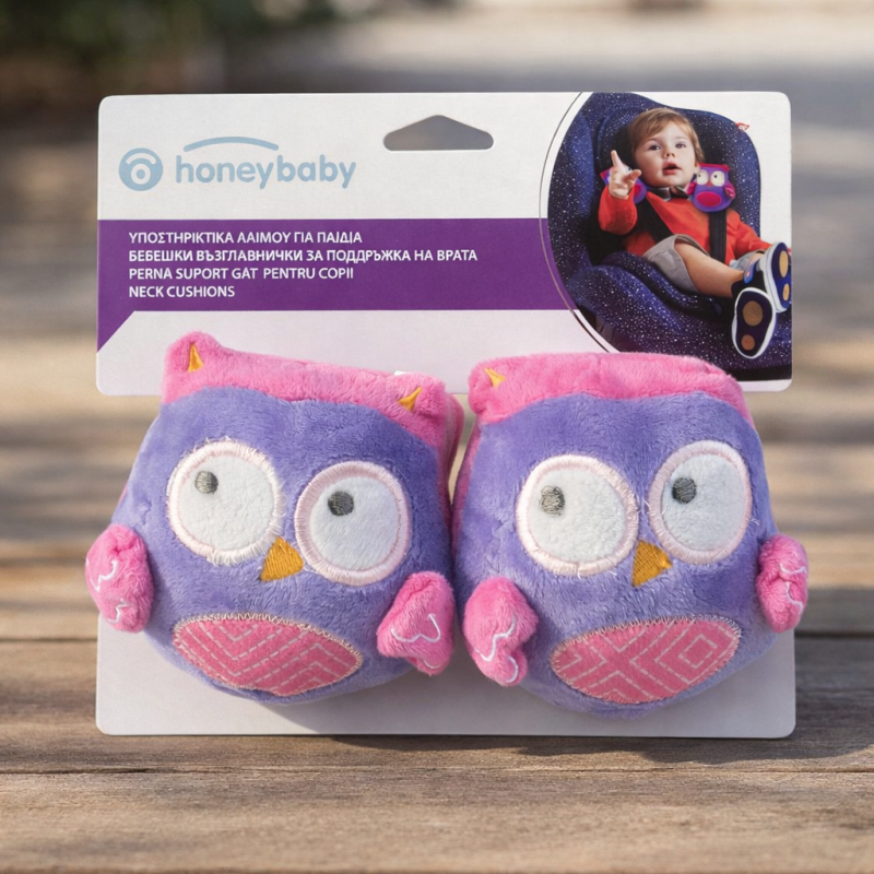Комплект от 2 броя бебешки възглавнички във формата на симпатични сови в розов цват за поддръжка на врата по време на път в бебешкото столче за кола.