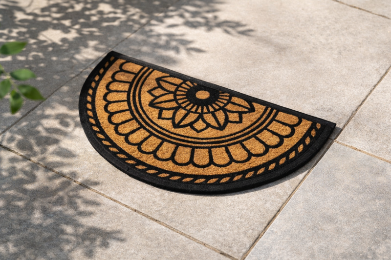 Входна изтривалка с декоративни орнаменти в бежово и черно с форма на полукръг, изработена от PVC и кокосови влакна.