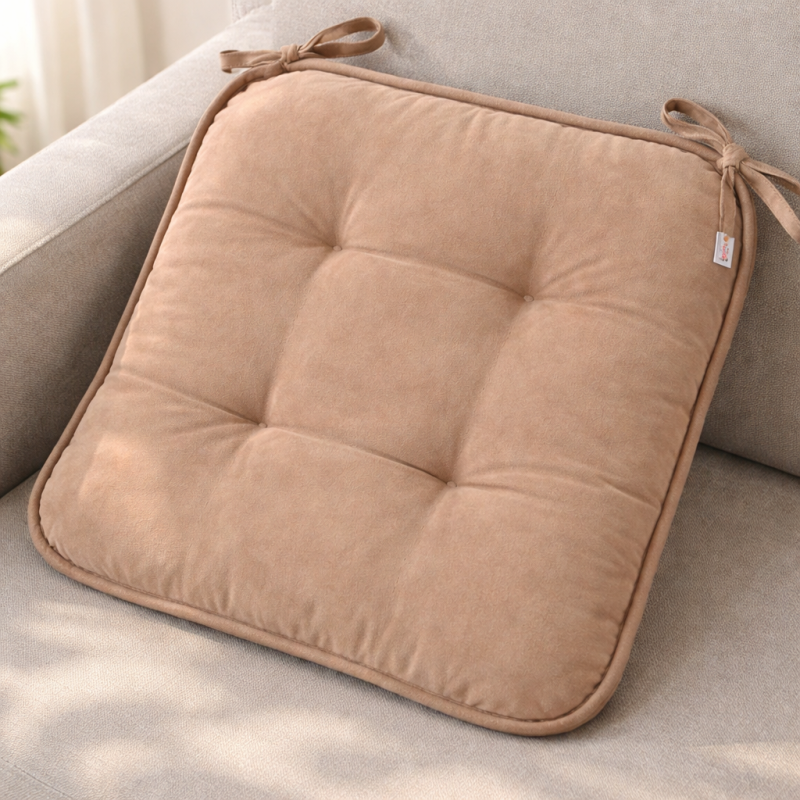 Квадратна декоративна възглавница за стол, изработена от полиестер в светло кафяв цвят с практични връзки.