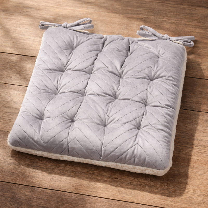 Квадратна декоративна възглавница за стол, изработена от полиестер с две лица - по-топлата страна е от висококачествения материал шепра, а другата страна е в сребристо сив цвят.