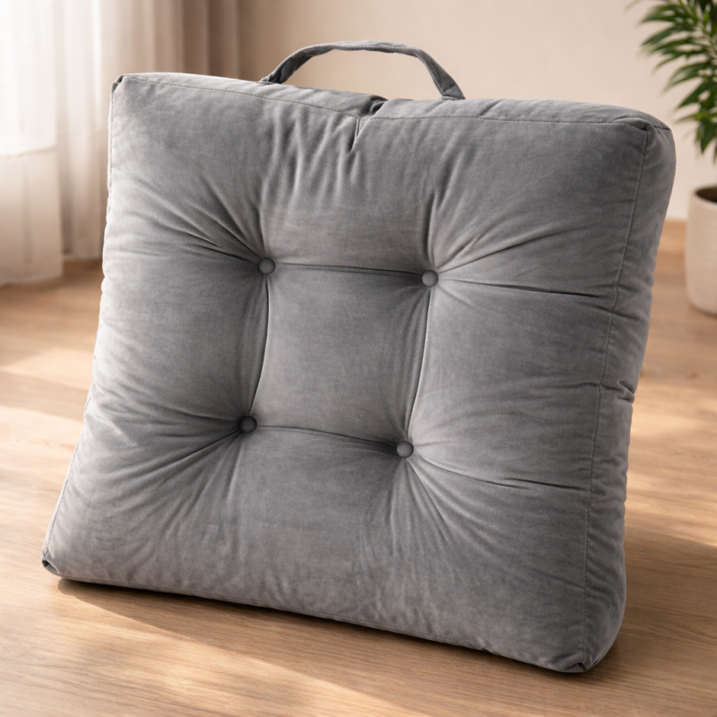 Квадратна декоративна възглавница за стол, изработена от полиестер в сив цвят с удобна дръжка.