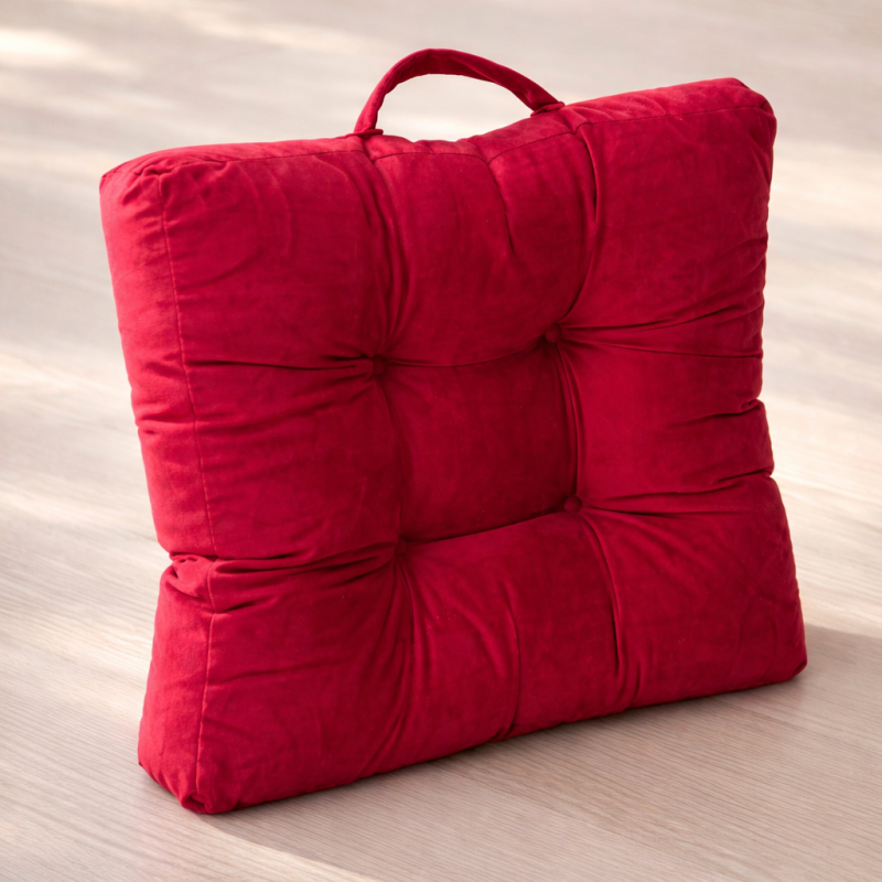 Квадратна декоративна възглавница за стол, изработена от полиестер в цвят бордо с функционална дръжка за лесно носене.