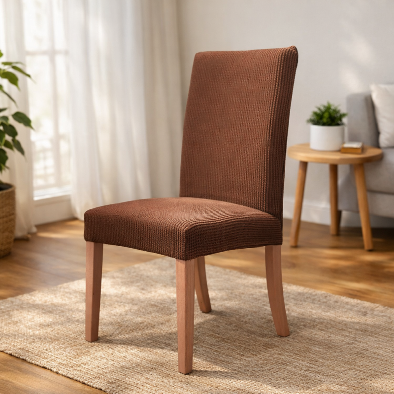 Декоративно еластично покривало за стол в кафяв цвят с релефни карирани шарки.