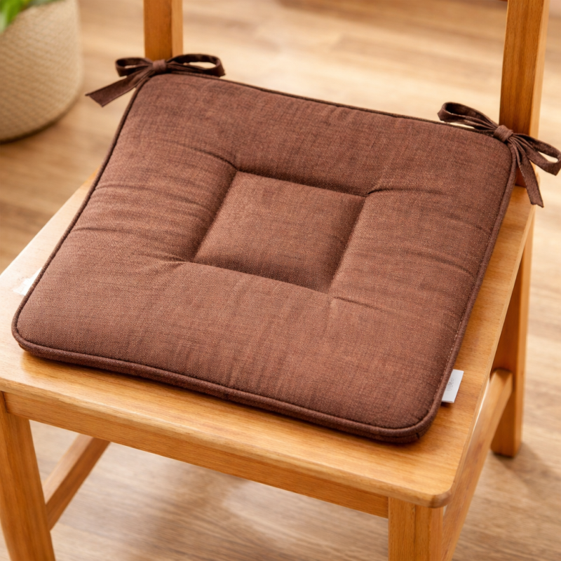 Квадратна декоративна възглавница за стол, изработена от памук, полиестер и дунапрен в кафяв цвят с функционални връзки.