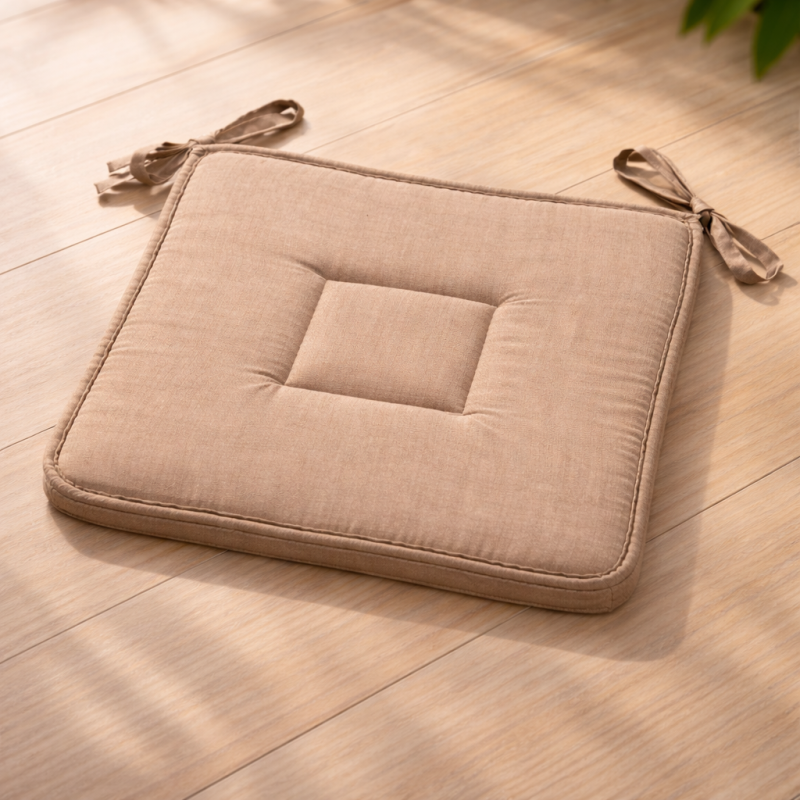 Квадратна декоративна възглавница за стол, изработена от памук, полиестер и дунапрен в бежов цвят с удобни връзки.