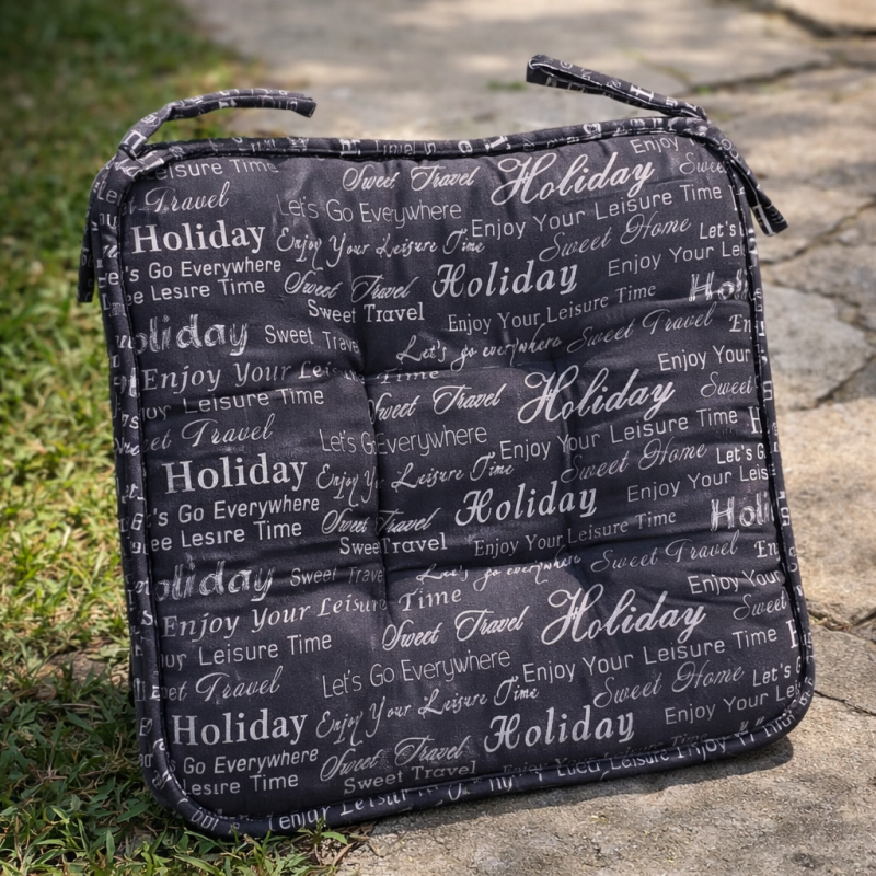 Квадратна декоративна възглавница за стол, изработена от поликотон и пяна в цвят графит с бели надписи и връзки за лесно прикрепване към стола.