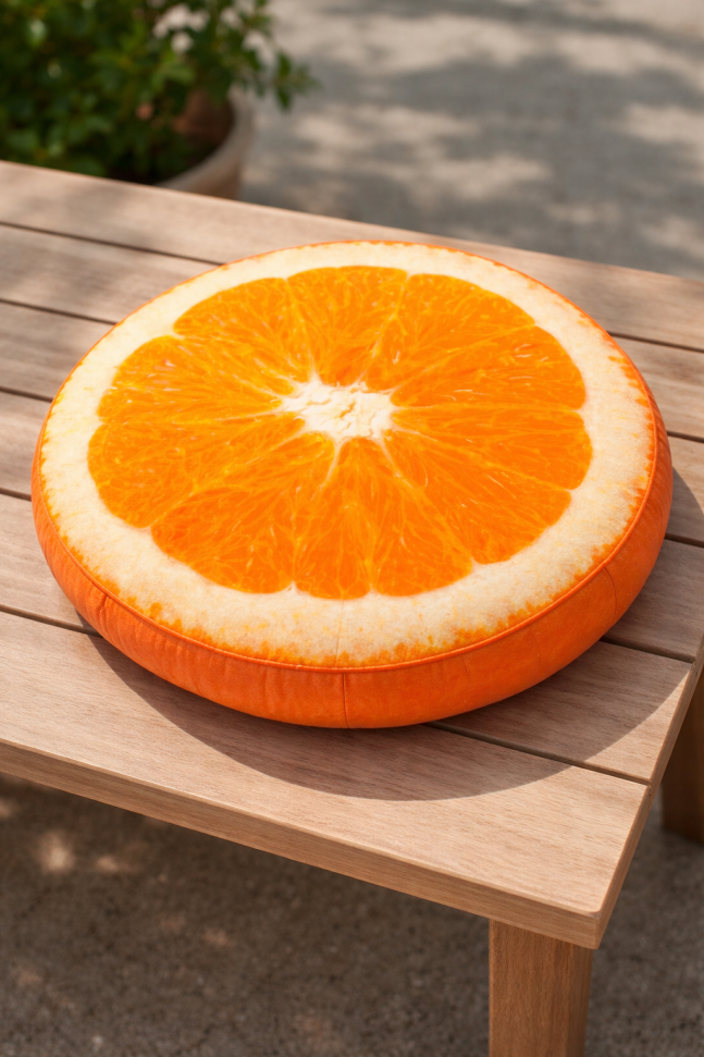 Ефектна декоративна възглавница за стол във формата на резен портокал, изработена от полиестер в оранжев цвят.