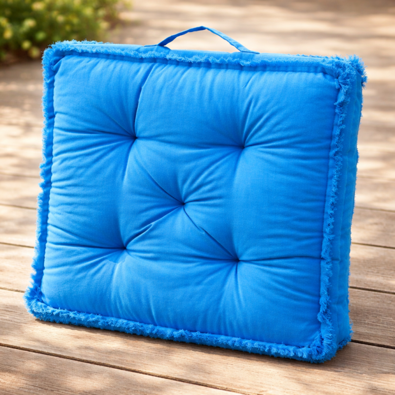 Квадратна декоративна възглавница за стол, изработена от памук в тюркоазено син цвят с удобна дръжка за лесно носене.