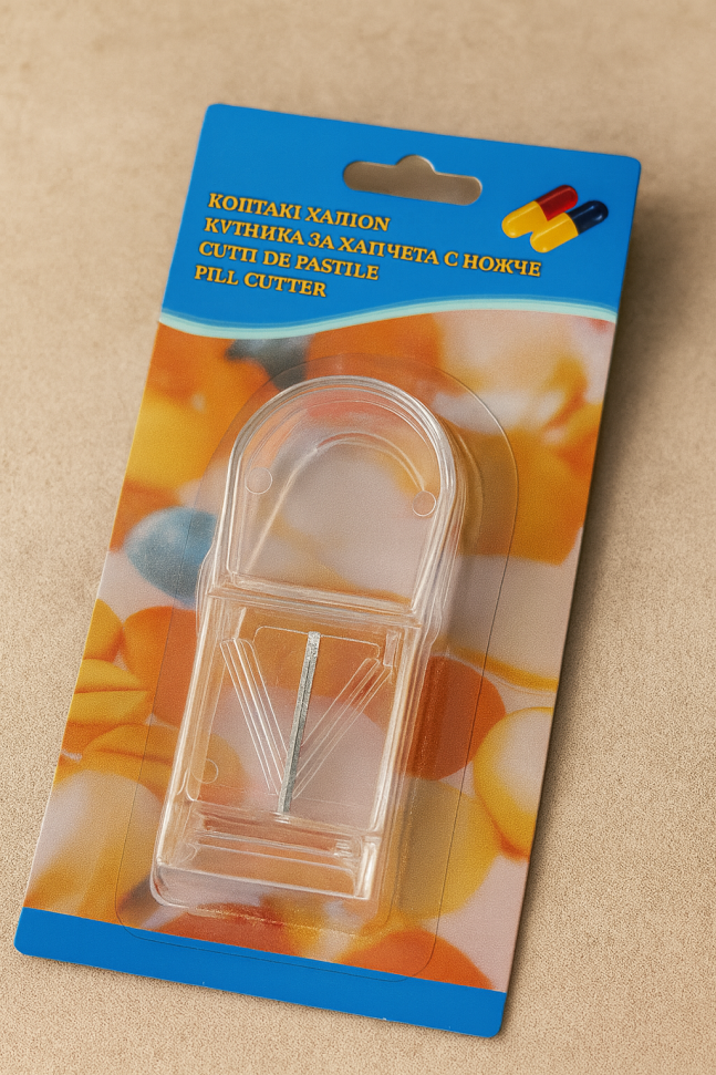 Кутия за хапчета, изработена от качествена прозрачна пластмаса с отделения и малко ножче за по-лесно разделяне на хапчетата.