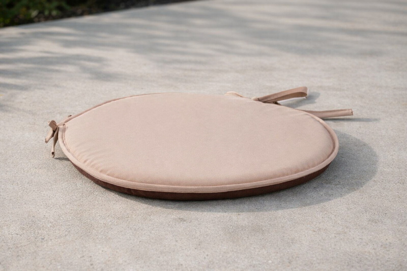 Кръгла декоративна възглавница за стол, изработена от полиестер с две лица - кафяво и бежово и практични връзки.