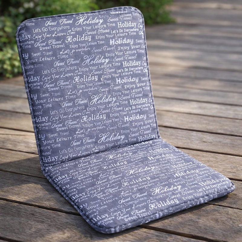Декоративна възглавница за стол с облегалка, изработена от памук, полиестер и пяна в цвят графит с надписи и стегнат ластик за стабилно прикрепване към стола.
