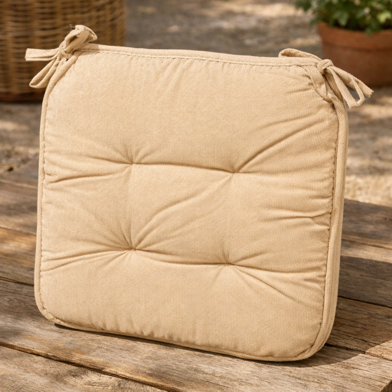 Квадратна декоративна възглавница за стол, изработена от полиестер в цвят екрю с удобни връзки.