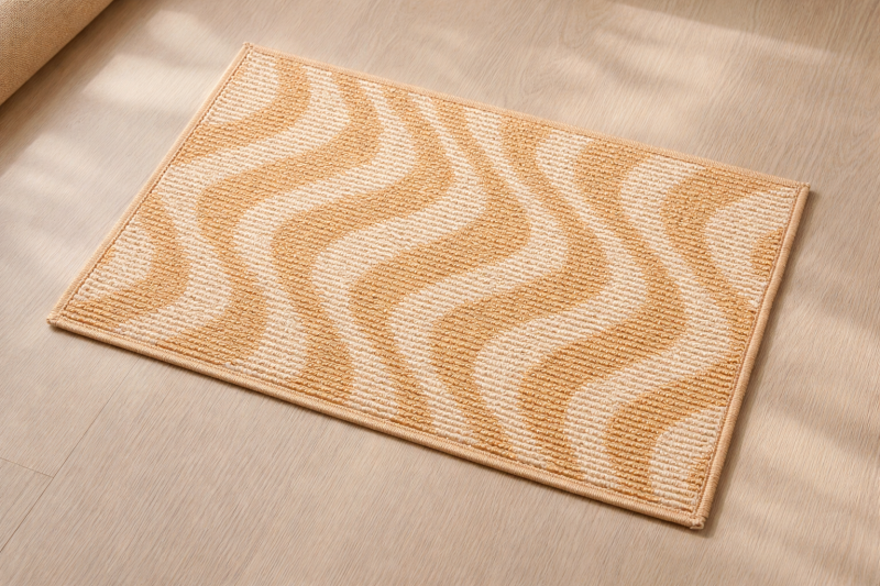 Постелка за под тип изтривалка, изработена от полипропилен и еластан с вълнообразни шарки в бежови нюанси.