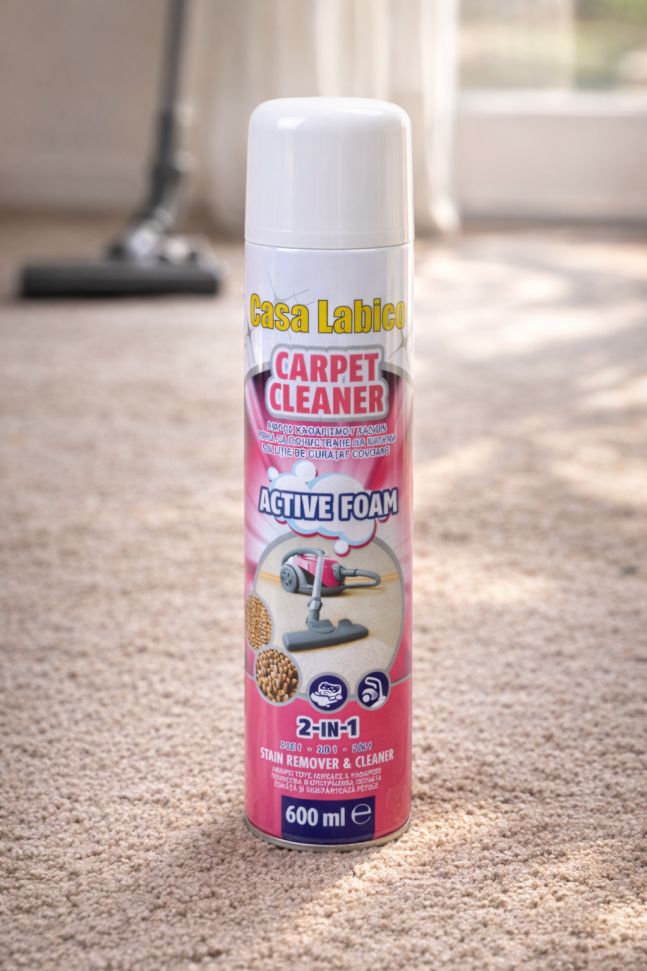 Активната пяна премахва упорити петна и замърсявания от килимите вкъщи и ги оставя освежени и като нови.