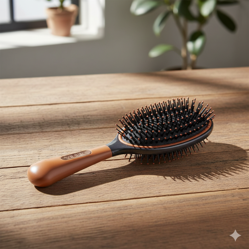 Овална четка за коса, изработена от качествена и здрава пластмаса в светло кафяв цвят с черни детайли.
