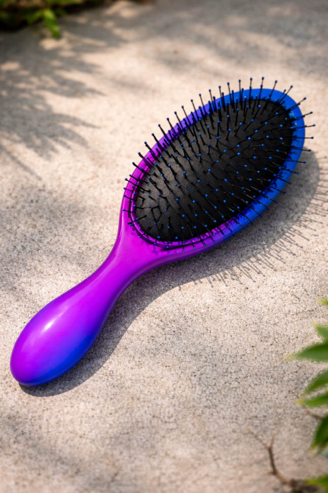 Овална четка за коса, изработена от трайна и качествена пластмаса в синьо-лилав цвят.