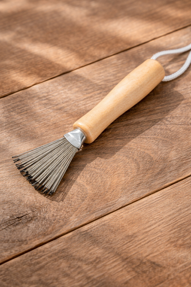 Инструмент за почистване на четки за коса с удобна дървена дръжка.