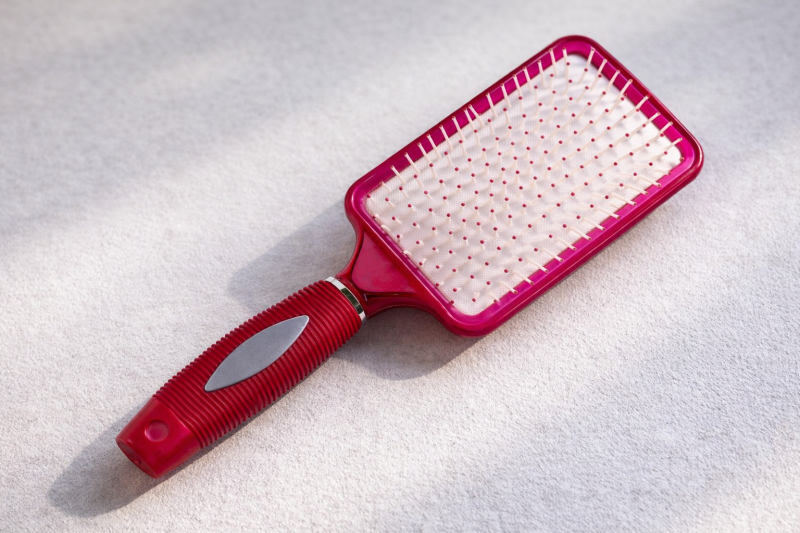 Четка за коса, изработена от качествена и трайна пластмаса с правоъгълна форма в цикламен цвят.