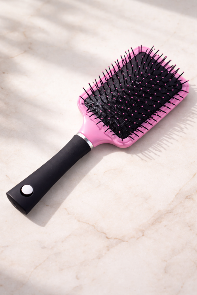 Четката за коса има пластмасови щифтове, които завършват с топчета, щадящи скалпа.