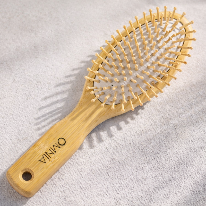 Овална четка за коса, изработена от качествена дървесина в естествен цвят.