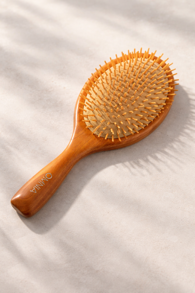 Четка за коса, изработена от качествена дървесина с овална форма в светло кафяв цвят.