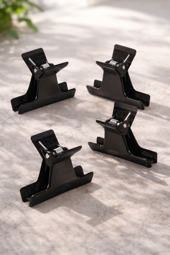 Комплект от 4 броя фризьорски щипки за коса тип пеперуди, изработени от качествена и здрава пластмаса в черен цвят.
