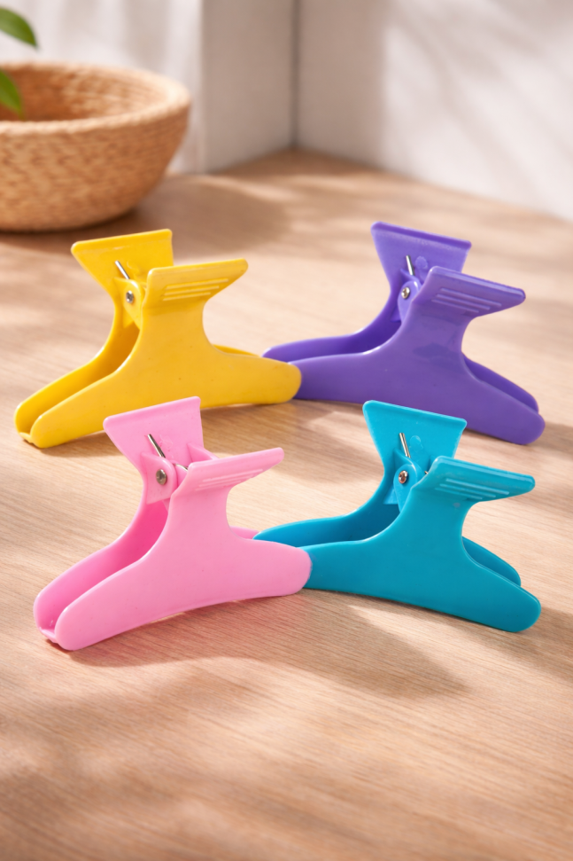 Комплект от 4 броя фризьорски щипки за коса тип пеперуди, изработени от качествена и здрава пластмаса в различни цветове.