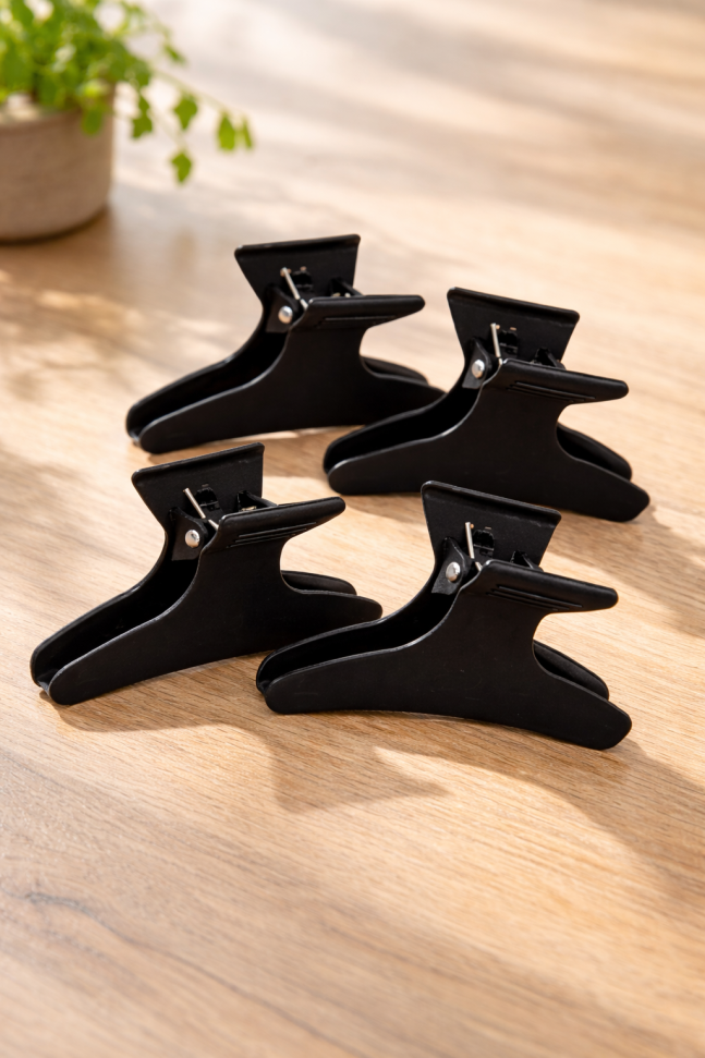 Комплект от 4 броя фризьорски щипки за коса тип пеперуди, изработени от качествена и трайна пластмаса в черен цвят.