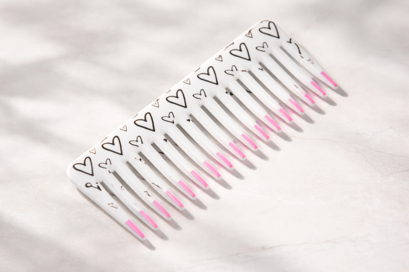 Широк гребен за коса, изработен от качествена пластмаса в бял цвят с принт на сърца.