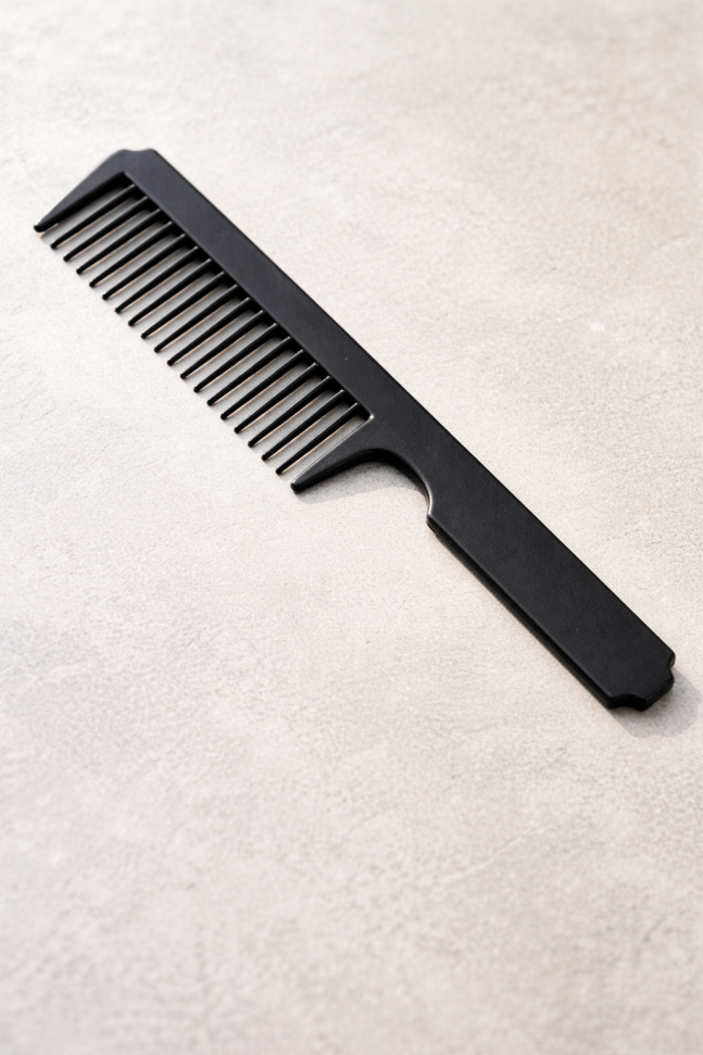 Гребен за коса, изработен от здрава пластмаса в черен цвят с дръжка.