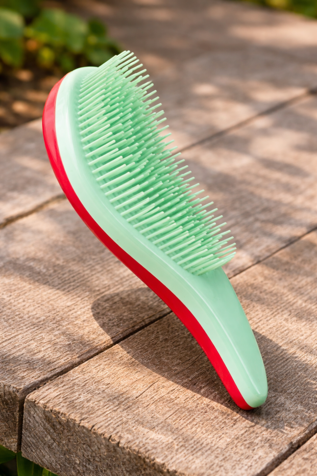 Четка за коса, изработена от качествена пластмаса в червено и светло зелено.