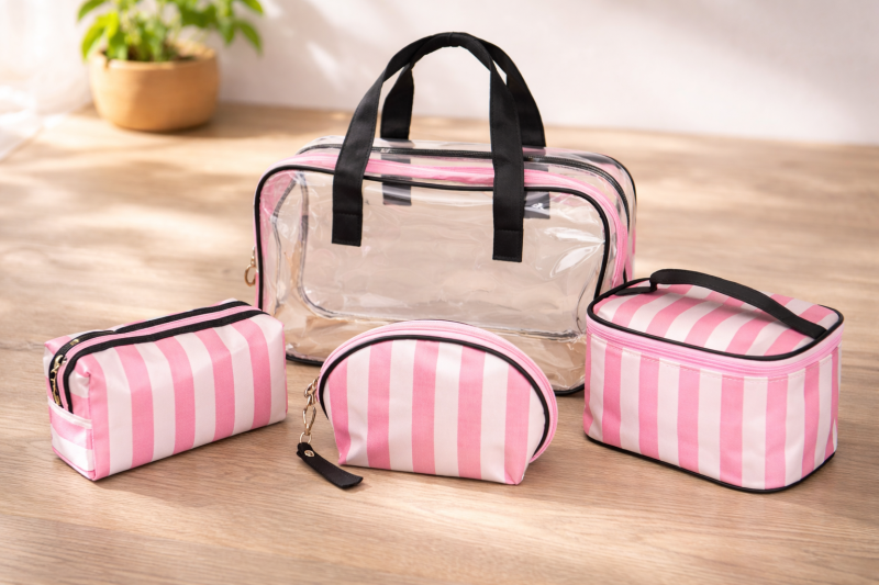 Комплект от 4 броя несесери с различни размери, изработени от PVC в бяло-розово райе с дръжка и цип.