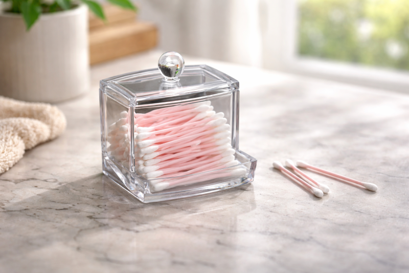 Практична поставка-диспенсър за клечки за уши, изработена от прозрачна пластмаса.