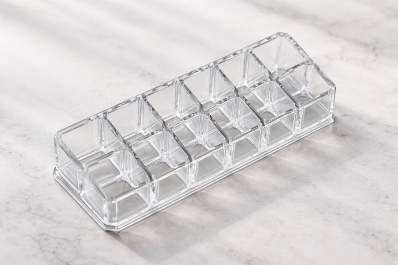 Поставка-органайзер за лакове за нокти, изработена от качетвена прозрачна пластмаса.