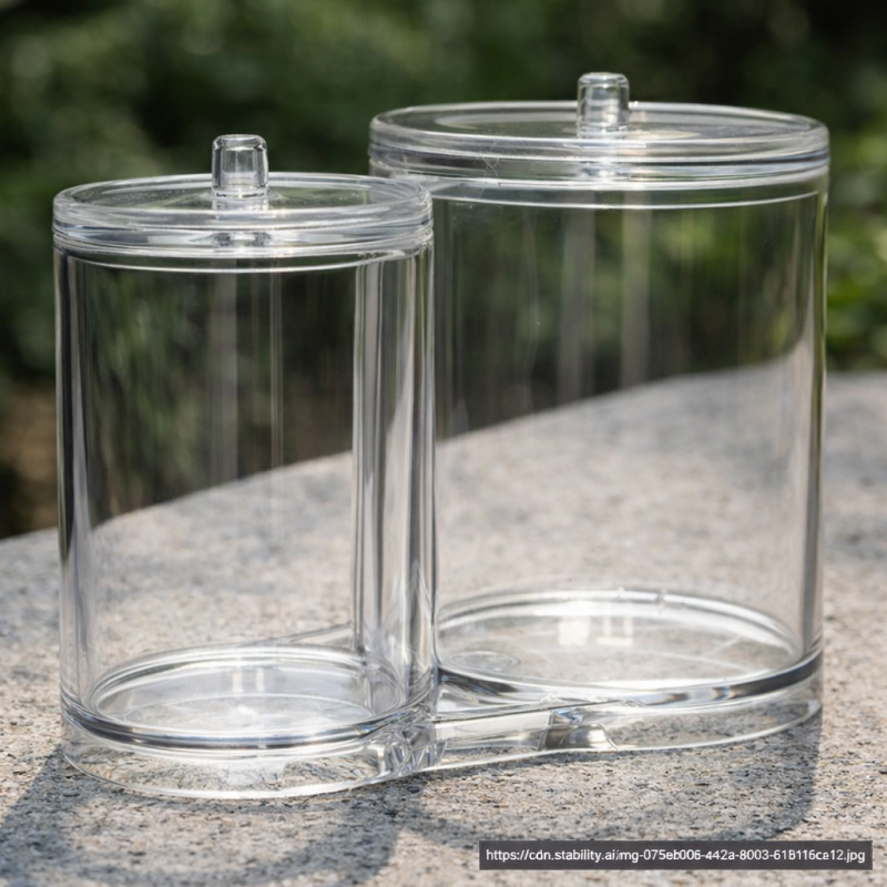 Удобна поставка-диспенсър с две отделения - за памучни тампони и клечки за уши, изработена от прозрачна пластмаса.