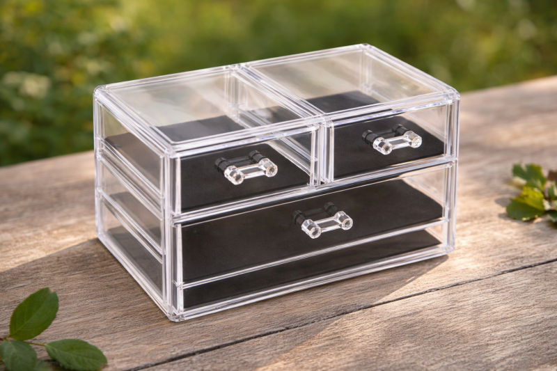 Кутия-органайзер за съхранение на гримове, изработена качетвена прозрачна пластмаса с 3 чекмеджета.
