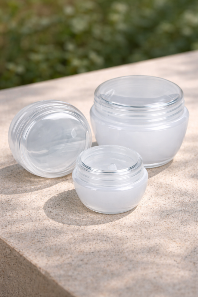 Комплект от 3 броя мини бурканчета за козметични кремове и лосиони, изработени от прозрачна пластмаса.