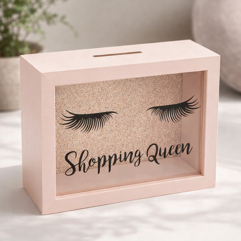 Детска дървена касичка в правоъгълна форма в бледо розово със стъклено прозорче с щампа на мигли и надпис Shopping Queen и отвор за пускане на монети в горната част.