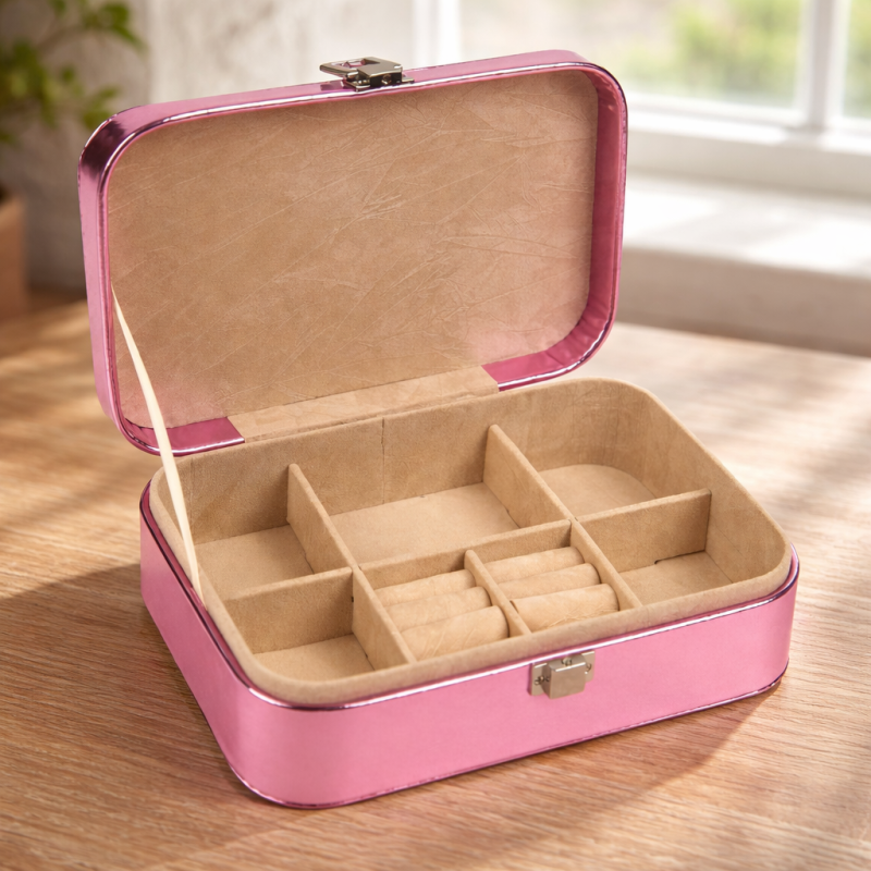 Кутия-огранайзер за бижута, изработена от качетвена пластмаса в розов цвят с 6 отделения (1 от които специално за пръстени) с кадифено покритие и заключващ клипс.