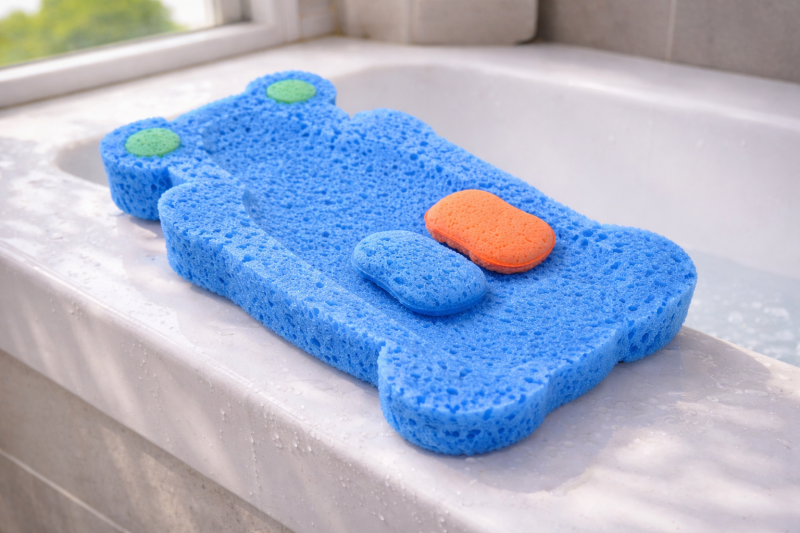 Бебешка гъба-подложка за вана, изработена от мек дунапрен в син цвят.