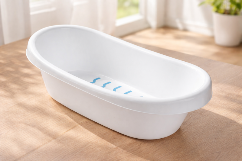 Бебешка вана за къпане, изработена от пластмаса в бял цвят с противохлъзгаща повърхност.