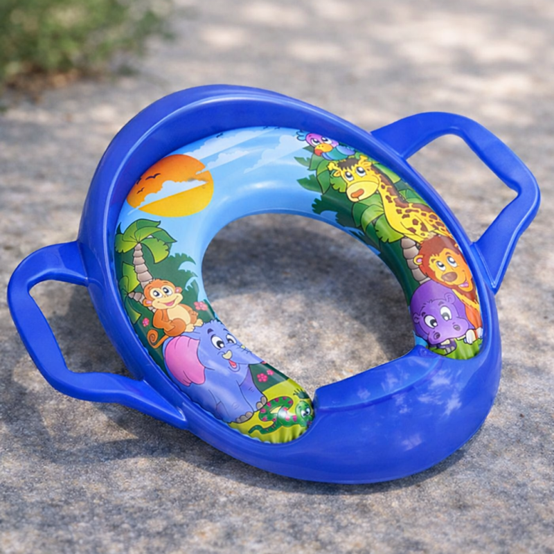 Детска подвижна седалка за тоалетна чиния, изработена от трайна пластмаса в син цвят с щампа на животните от джунглата и две дръжки ръкохватки, които ще помагат на детето да остане на място и ще му вдъхват увереност.