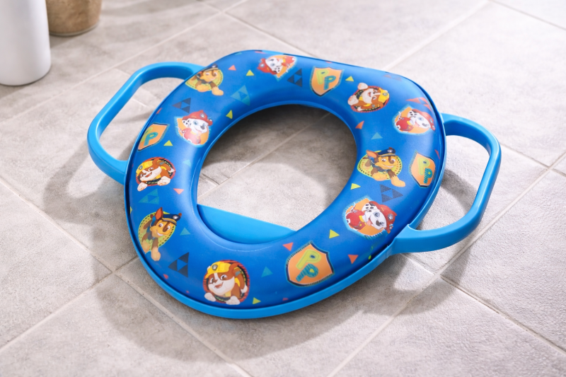 Детска подвижна седалка за тоалетна чиния, изработена от трайна пластмаса в син цвят с щампа на героите от Paw patrol и две дръжки ръкохватки, които ще помагат на детето да остане на място и ще му вдъхват увереност.