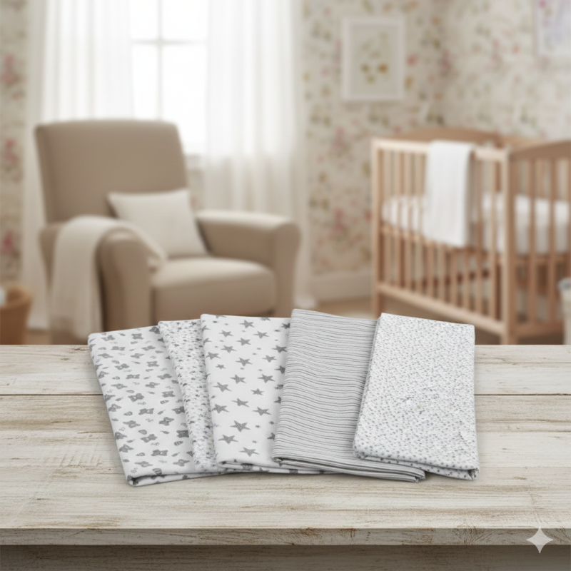 Комплект от 4 броя бебешка фланелена пелена с различни десени в бежови нюанси - райе, звезди, точки и мечета.