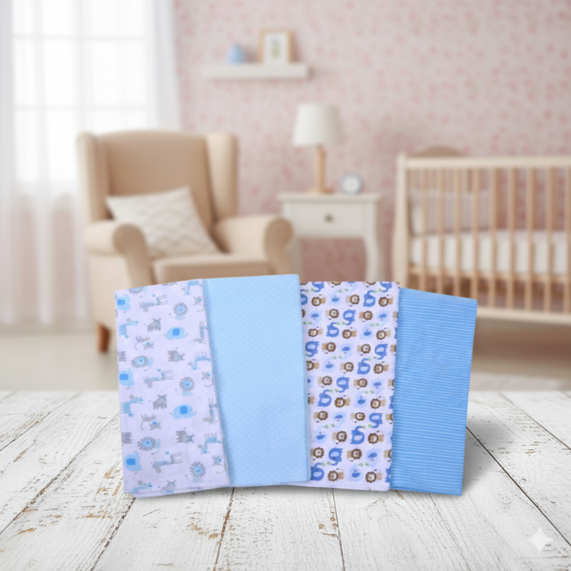 Комплект от 4 броя бебешка фланелена пелена с различни десени в светло сини нюанси - райе, звезди, точки и животни.