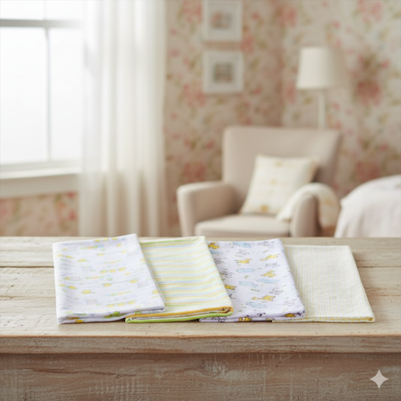 Комплект от 4 броя бебешка фланелена пелена с различни десени в жълти нюанси - райе, точки и животни.