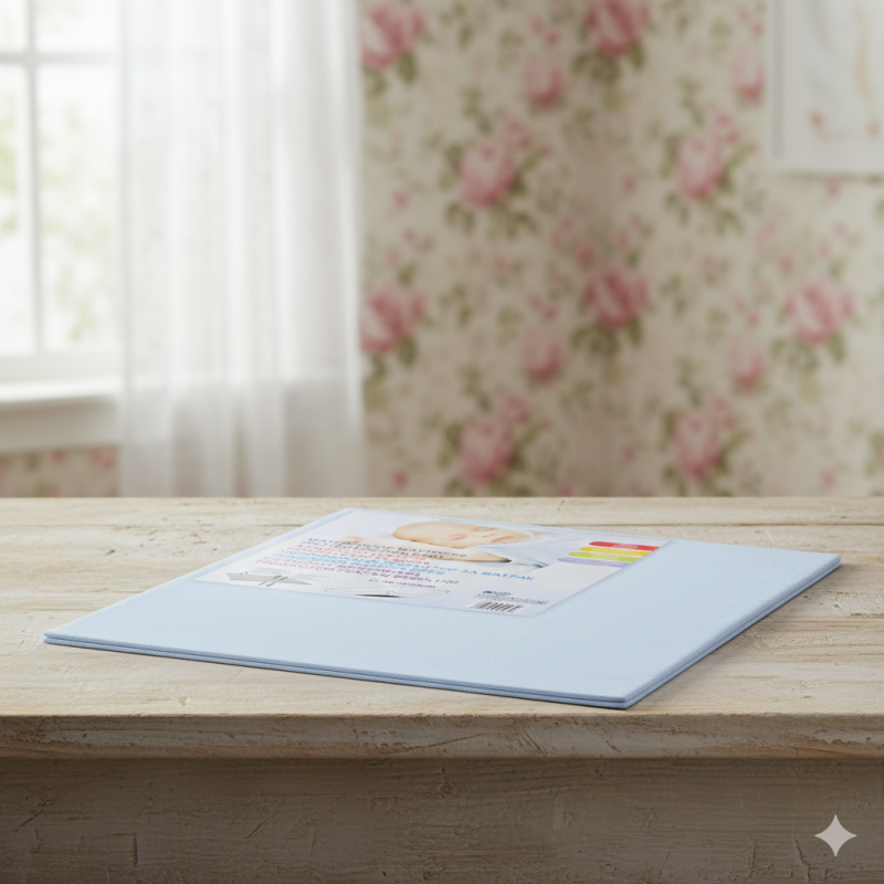 Непромокаем протектор за матрак за бебешко легло, изработен от полиестер и памук с непромокаемо покритие в светло син цвят.