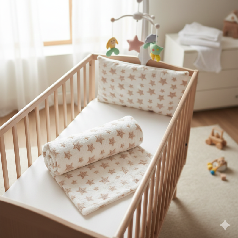Покривка за бебешко легло, изработена от висококачествен и мек полиестер в бял цвят с принт на бежови звезди.